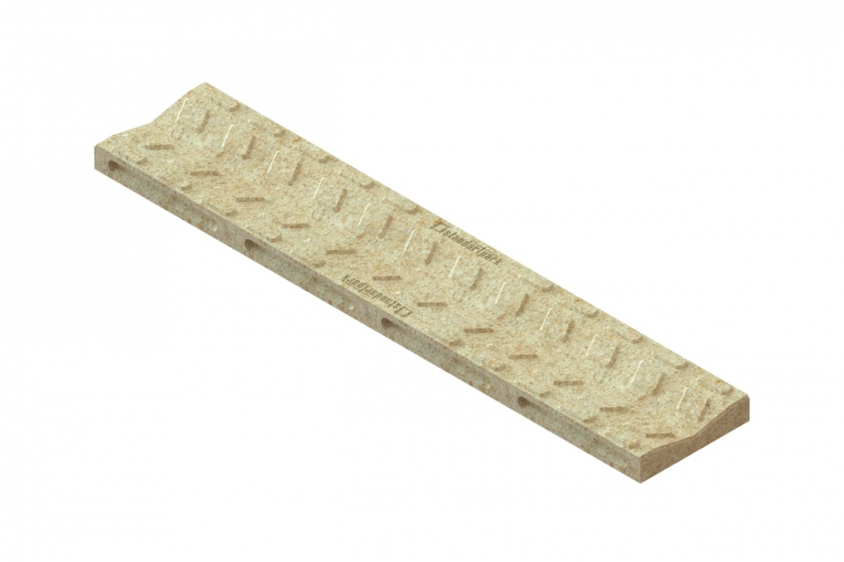 Поверхность водоотводного лотка имеет специальный рельеф в виде регулярно повторяющихся углублений и выпуклостей, ориентированных в одном направлении. Этот рисунок, напоминающий серию галочек, выполняет важную функциональную задачу: эффективно направляет поток сточных вод, обеспечивая их движение строго по заданному маршруту.