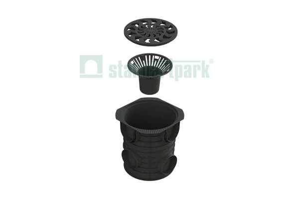 Продажа осуществляется комплектами, в который входит: круглый дождесборник, пластиковая решетка и мусоросборная корзина.