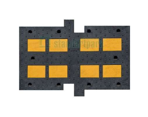 Материал изделия – черный полимерный композит. Он очень прочный, выдерживает большие динамические нагрузки, не боится суровых погодных условий. Лежачие полицейские могут эффективно эксплуатироваться в температурном диапазоне от –50°С до +60°С. На поверхности модуля размером 900х500 мм расположено 8 небольших углубления со светоотражающими желтыми вставками, которые делают неровность заметной на расстоянии.