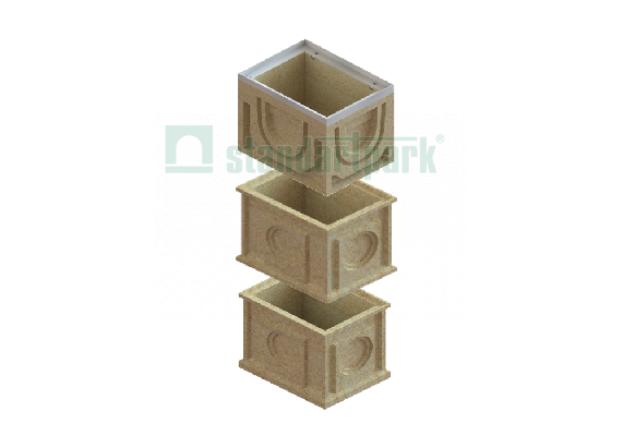 Верхний элемент комплектуется чугунной решеткой, которая крепится к усиливающим насадкам, впрессованным в тело колодца. Стальная оцинкованная/нержавеющая корзина, исполняющая функцию сбора мусора со сточных вод, ставится на выступы в нижнем элементе или на дно. Класс нагрузки – F900 позволяет выдерживать до 90 тонн и интенсивное движение автотранспортных средств.