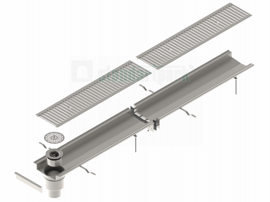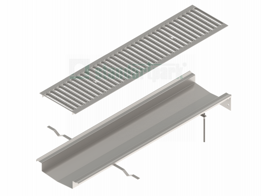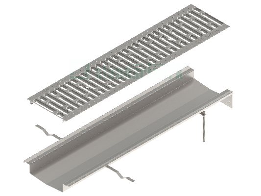 Система состоит из лотка (обеспечивает сбор сточных вод) и установленной на него водоприемной решетки (защищает от засорения крупным мусором и позволяет безопасно передвигаться по поверхности канала).