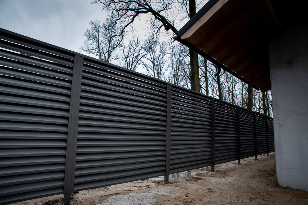 Альтернатива деревянному забору. Представляет собой металлические ламели, закрепленные на каркасе. Отличается долговечностью, стильным внешним видом и устойчивостью к погодным условиям.